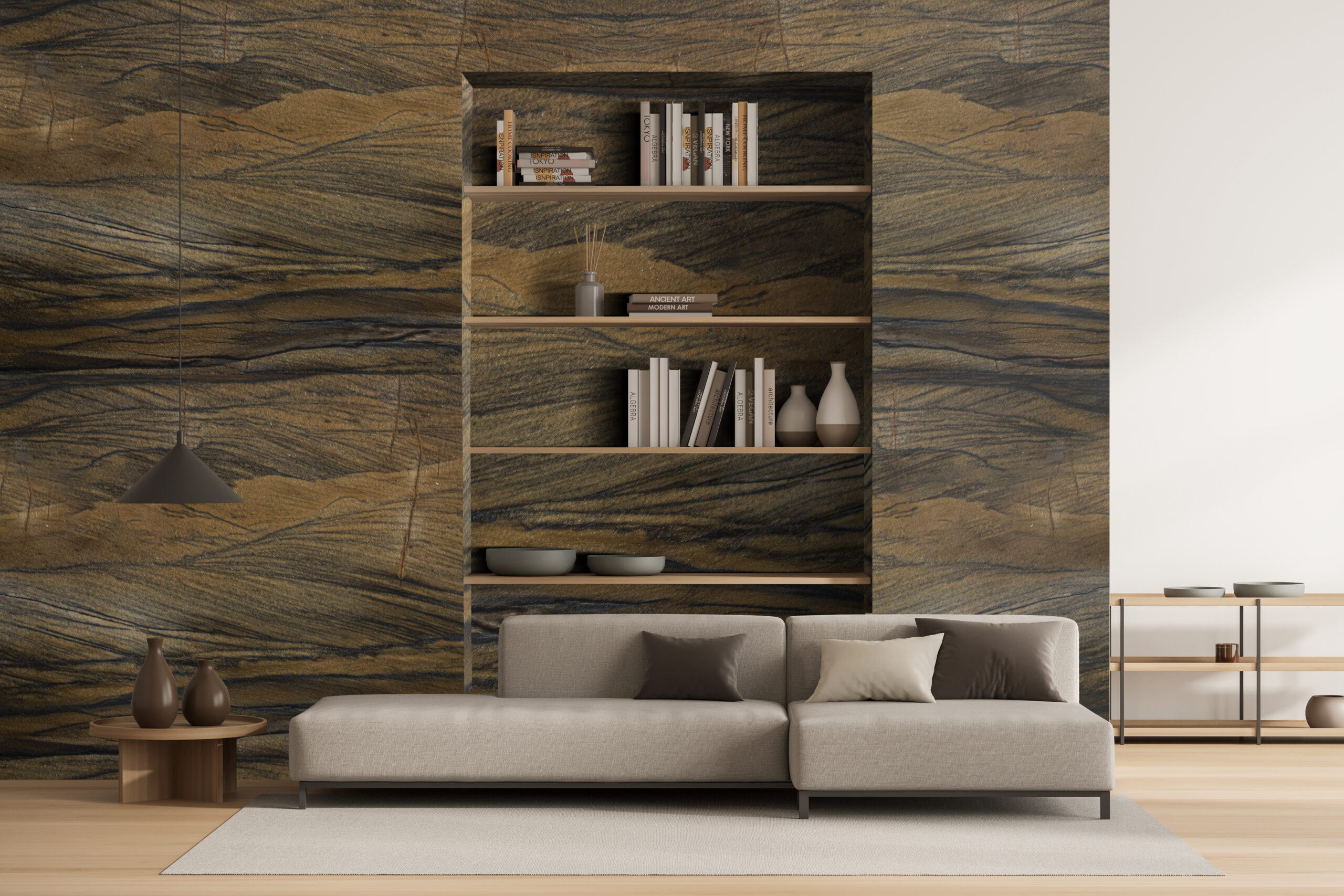 Mais que memorável, inesquecível. O quartzito Bronzo é daqueles elementos que não passam despercebidos, destacando-se onde quer que seja aplicado. Caracterizada pela estética vintage, a pedra de tom amarelo e rajadas escuras é rara: há apenas três tipos de quartzitos onde o xisto é dominante. Essa característica diferencia a textura do produto, que se assemelha ao couro, além de impedir o polimento do material, disponível apenas na versão fosca. O Bronzo é comumente indicado para uso indoor, garantindo cenários dramáticos e deslumbrantes.