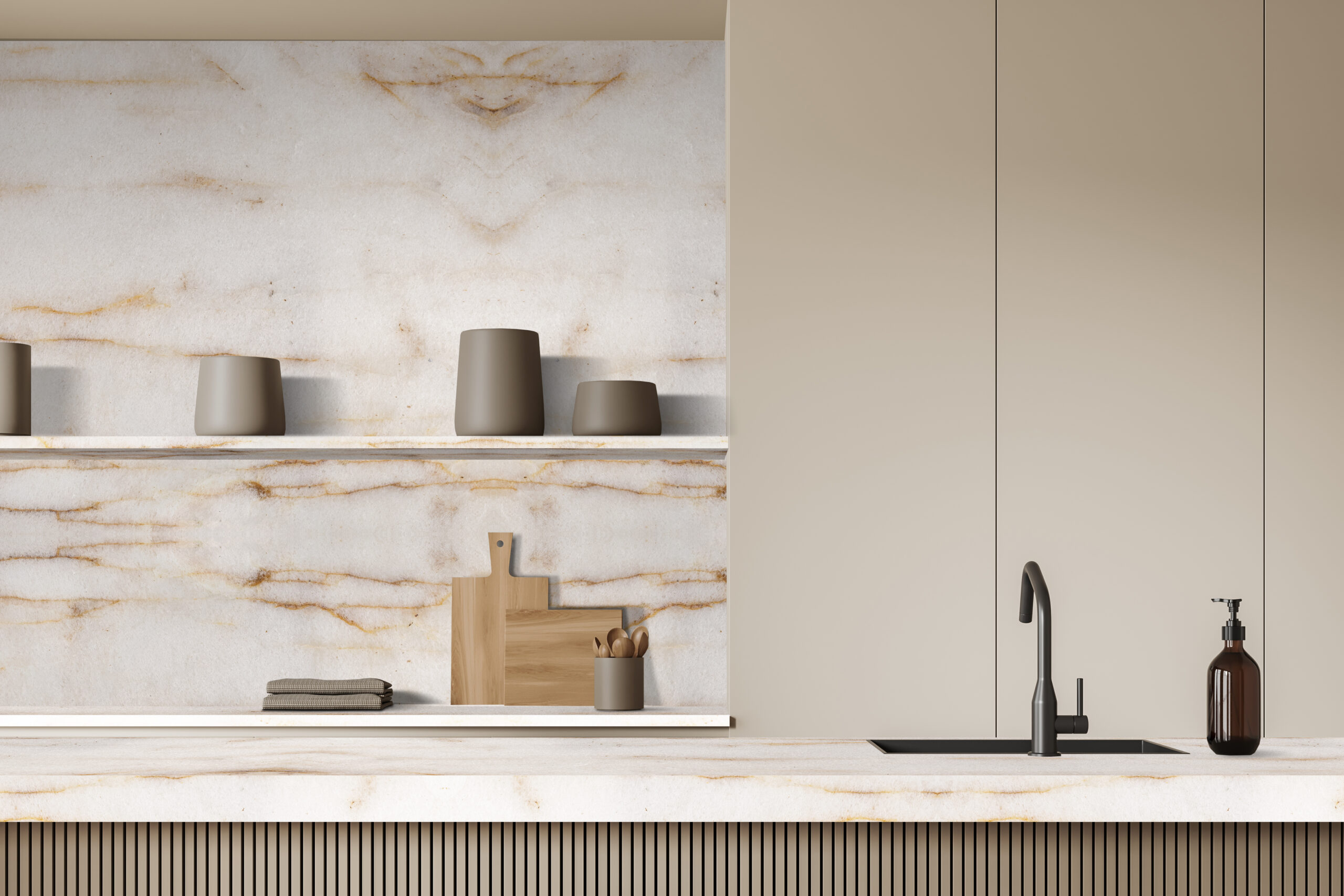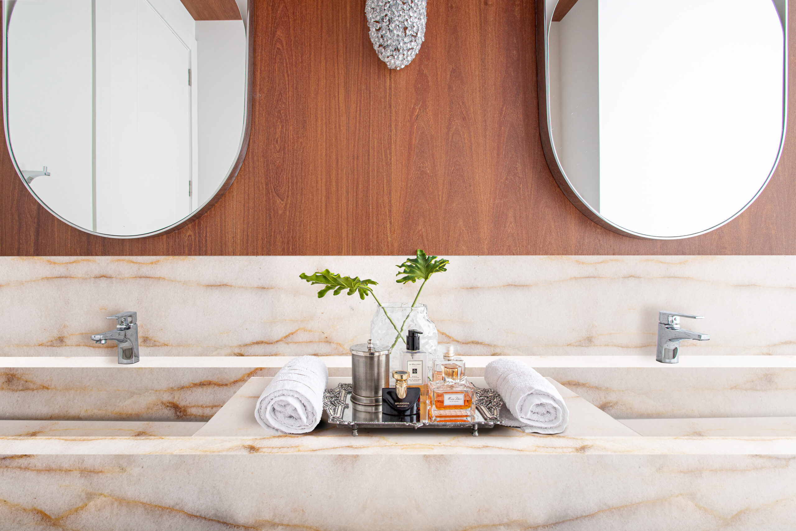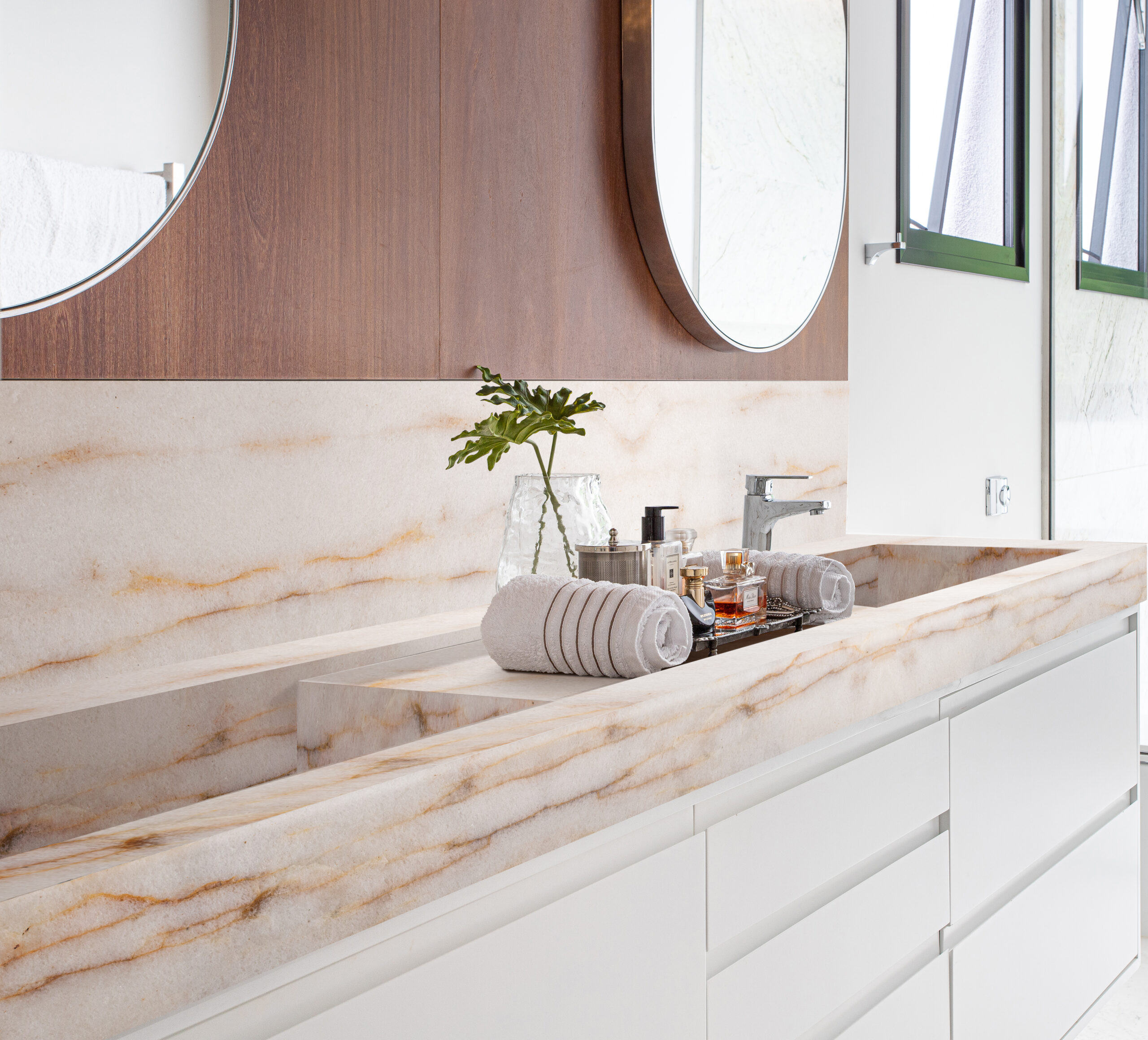 Considerada uma pedra purificadora, presente em terapias com cristais, o quartzito Cristal Tundra mescla tonalidades esbranquiçadas — quanto mais branca, mais rara e nobre se torna a peça. Um design de excelência, assinado pela própria natureza, os veios da rocha podem ser dourados, acobreados e até pretos, conferindo ousadia aos espaços onde é aplicada. O quartzito também não possui limitação de aplicação e é considerado extremamente resistente, podendo ser utilizado tanto em ambientes internos, quanto em áreas externas sem contraindicações.