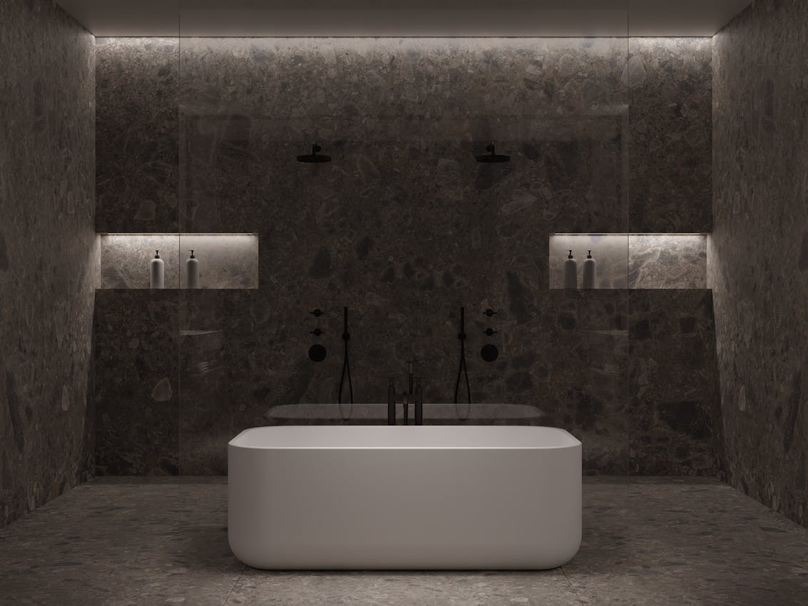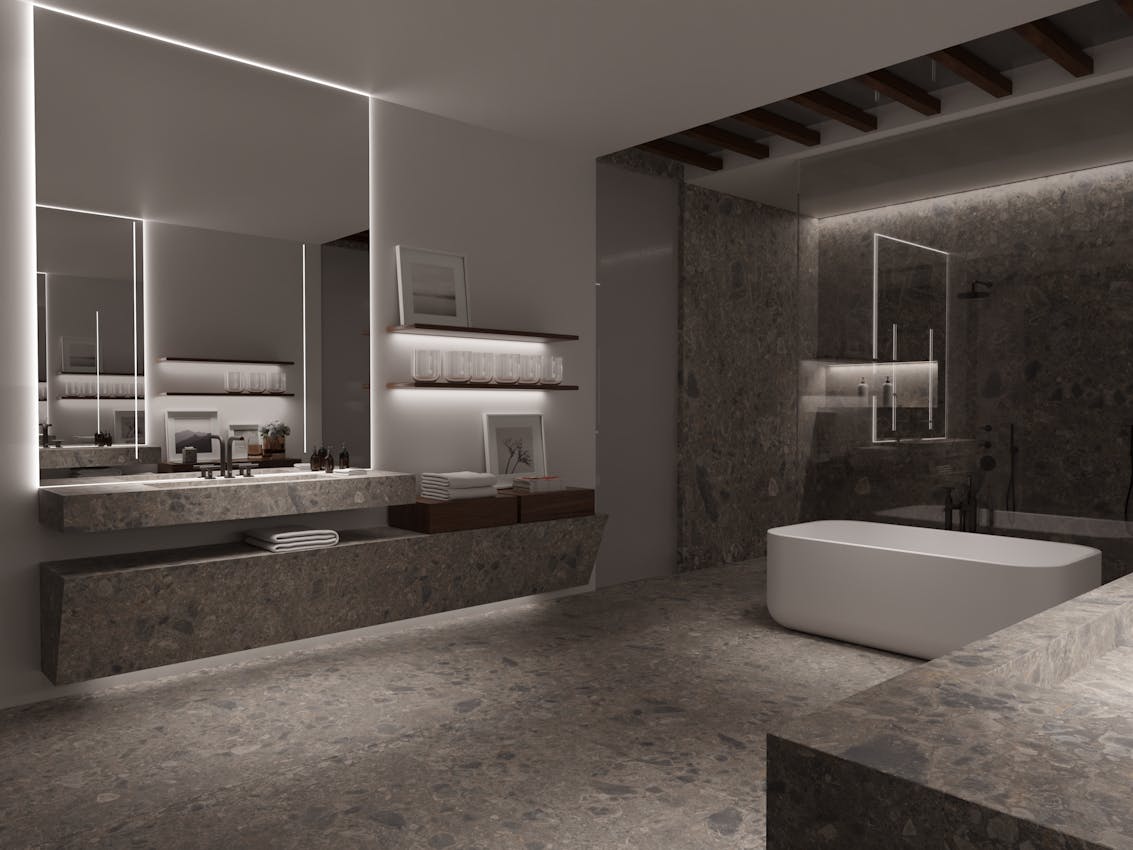 A estrutura multiforme azul‑acinzentada distinta da pedra italiana Ceppo di Gré inspira esta cor única. Ideal tanto para interiores como para exteriores, o seu design atemporal torna‑o a escolha perfeita para um visual clássico ou moderno.