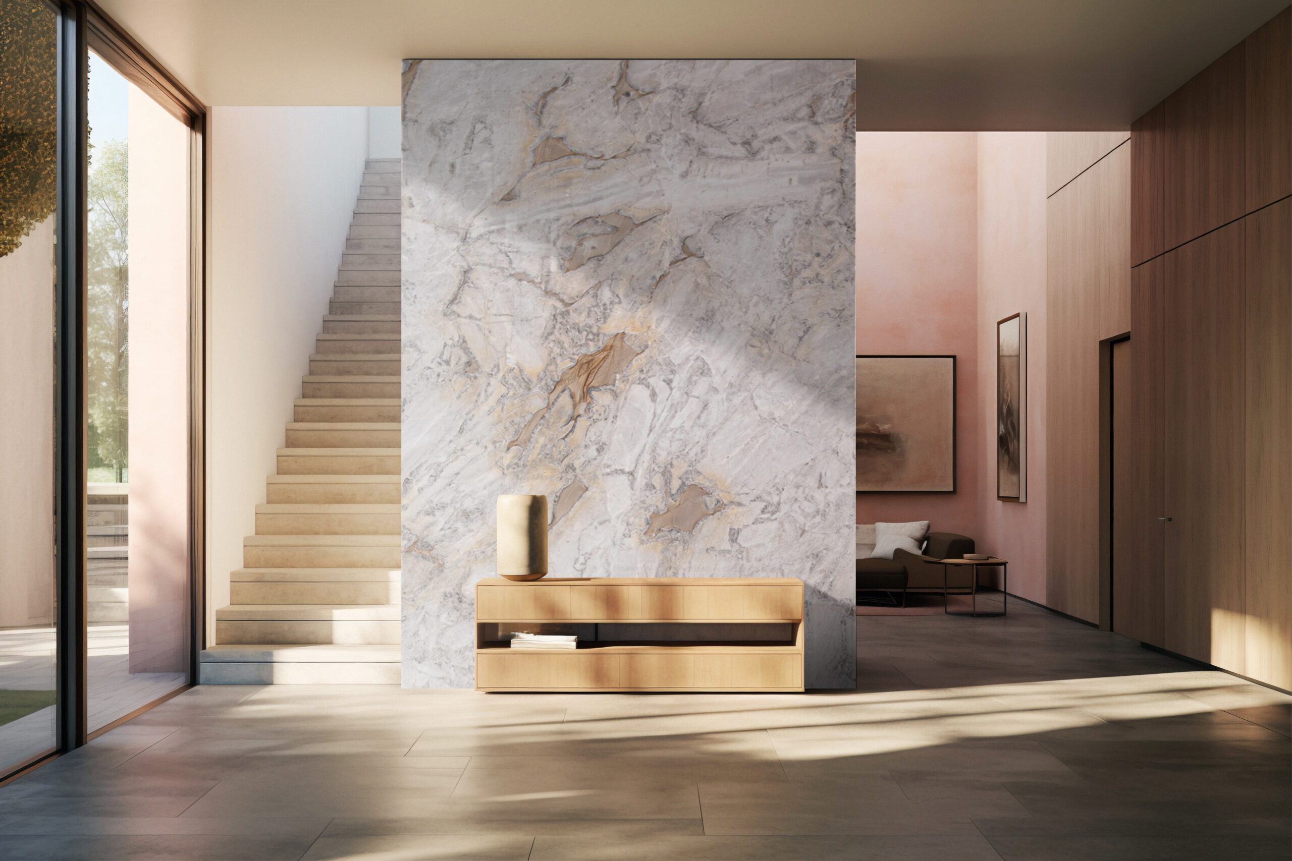 Grandes desenhos em dourado, que lembram o formato de nuvens, definem a estética do mármore Machiaoro Premium. O fundo branco destaca as linhas coloridas e os veios acinzentados, surgindo uma pedra difícil de ser esquecida. Considerada rara, a peça é encontrada em poucas quantidades, comum apenas no primeiro corte de retirada. Apesar disso, é uma queridinha no mercado: altamente procurada, agrega um glamour inconfundível aos ambientes. Aos que buscam exclusividade, o Machiaoro Premium é o revestimento perfeito: quanto maiores suas manchas e quanto mais homogênea a sua distribuição na chapa, mais nobre é o material.