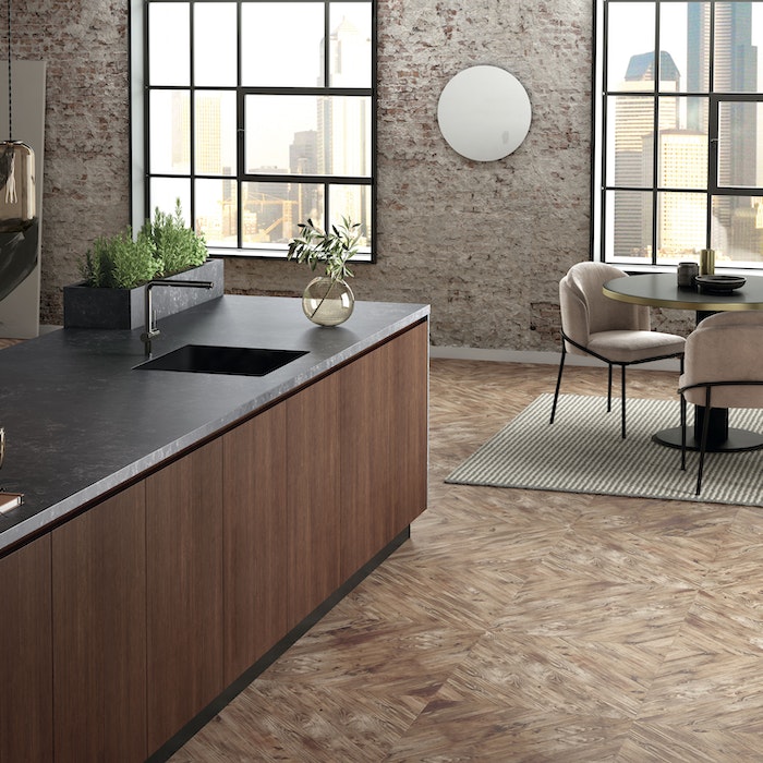 Em um breu surge o Silestone Corktown, com pontos de tons castanhos e um brilho suave. O elemento pode ser equilibrado com composições do estilo moderno ao industrial, oferecendo intensidade e funcionalidade aos cenários.